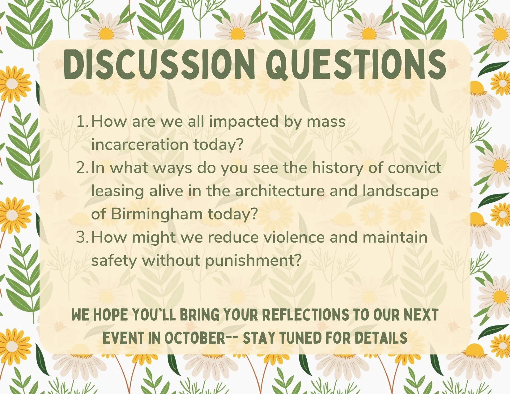 We wanted to begin this event series by examining the legacy of incarceration and convict leasing in Alabama. We hoped to expose the roots of the modern prison system and many of its ills, provoke deep thought and discussion about the impacts of the prison system on our society, and lay the foundation for the rest of our project series.